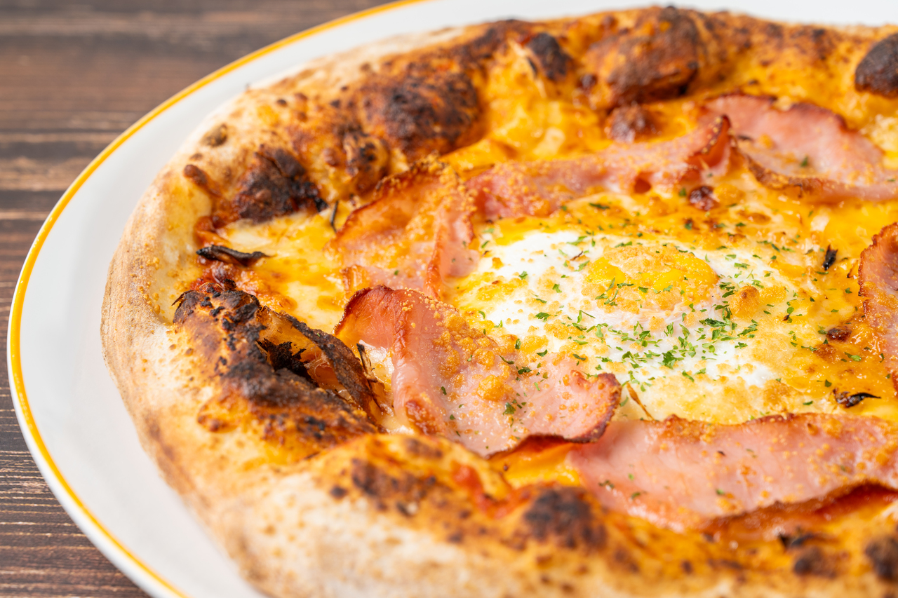 とろとろ半熟卵とハムの香ばしさが食欲をそそる贅沢なピザ