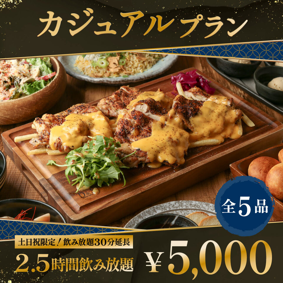 《DENのカジュアルライトプラン!2.5時間飲み放題付き‼》人気&季節の前菜3種や料理長お勧めお肉料理など全5品 お一人様5,500円