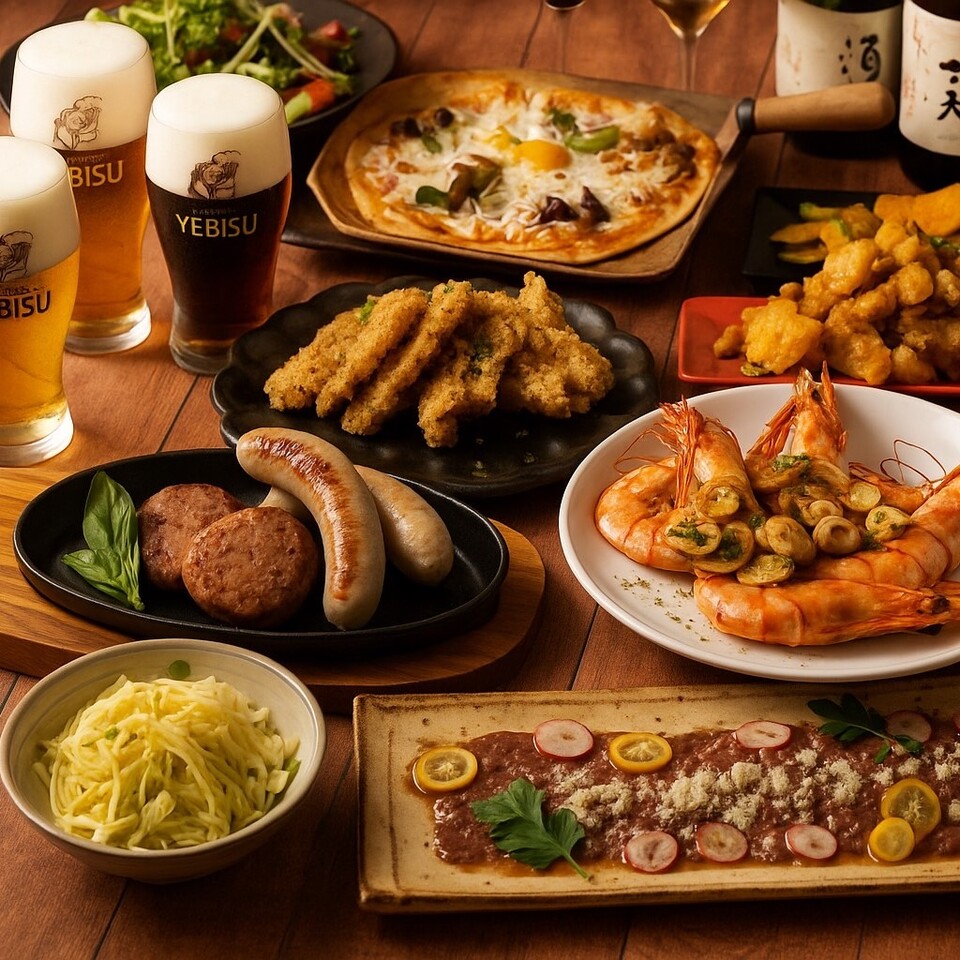 さらに、おひとり様+500円でYEBISU全種や話題の新提案ソラチラテ、ワイン、ウイスキー、女性に嬉しい生絞りサワー等が充実した約100種類以上のプレミアム飲み放題にグレートアップが可能です♪詳しくは飲み放題メニューをご覧ください。