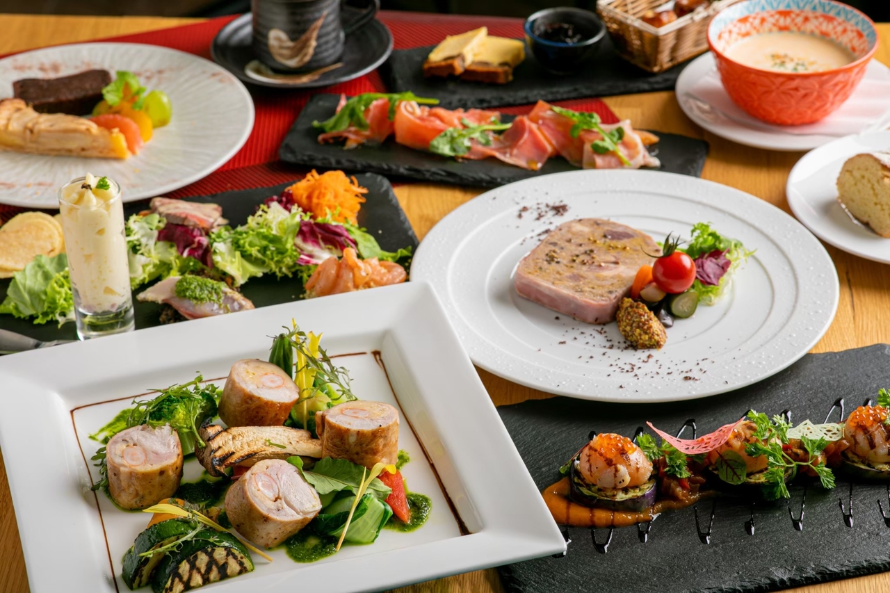 ミニスープ・おまかせ前菜・サラダ・パン・魚料理・肉料理・デザート