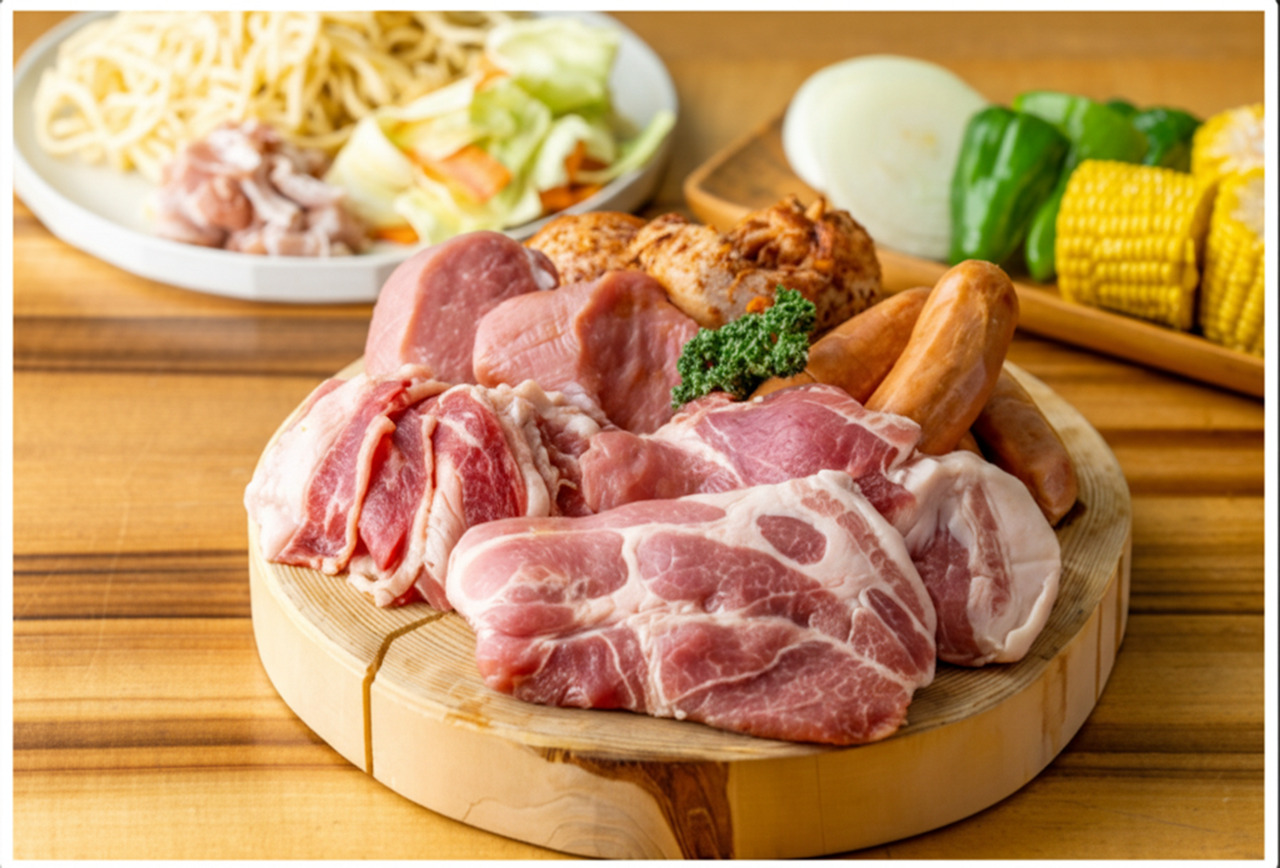 食材と器材一式(椅子、テーブル含む)、炭、トング、食器などの備品もコミコミ!