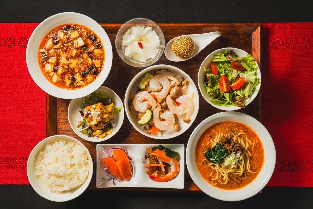 季節の前菜盛り合わせ/生ロブスターの炒め 色野菜添え/ 和牛の唐辛子炒め/吉切鮫と上海蟹の煮込み 青野菜添え/県産鮮魚と有頭海老の強火蒸し/麻婆豆腐と白ご飯 又は 小さな担々麵/デザート色々