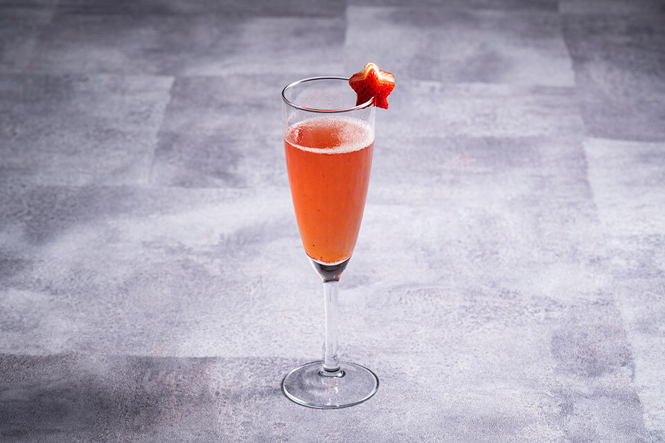 A sparkling cocktail featuring the sweet-tart notes of Yoshino Monogatari strawberry liqueur, delicately layered with a soft rose aroma. Enjoy it adorned with a charming star-shaped strawberry.