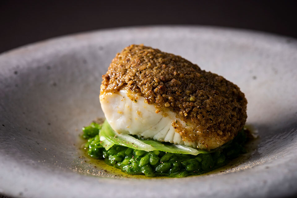 Enjoy it with green risotto, infused with the savory taste of shellfish, served as a sauce.