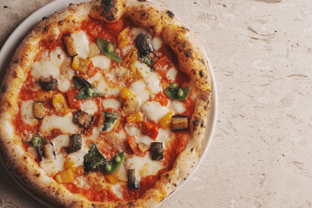トマトソース、モッツァレラ、ペコリーノチーズ、ズッキーニ、ナス、パプリカ、季節野菜