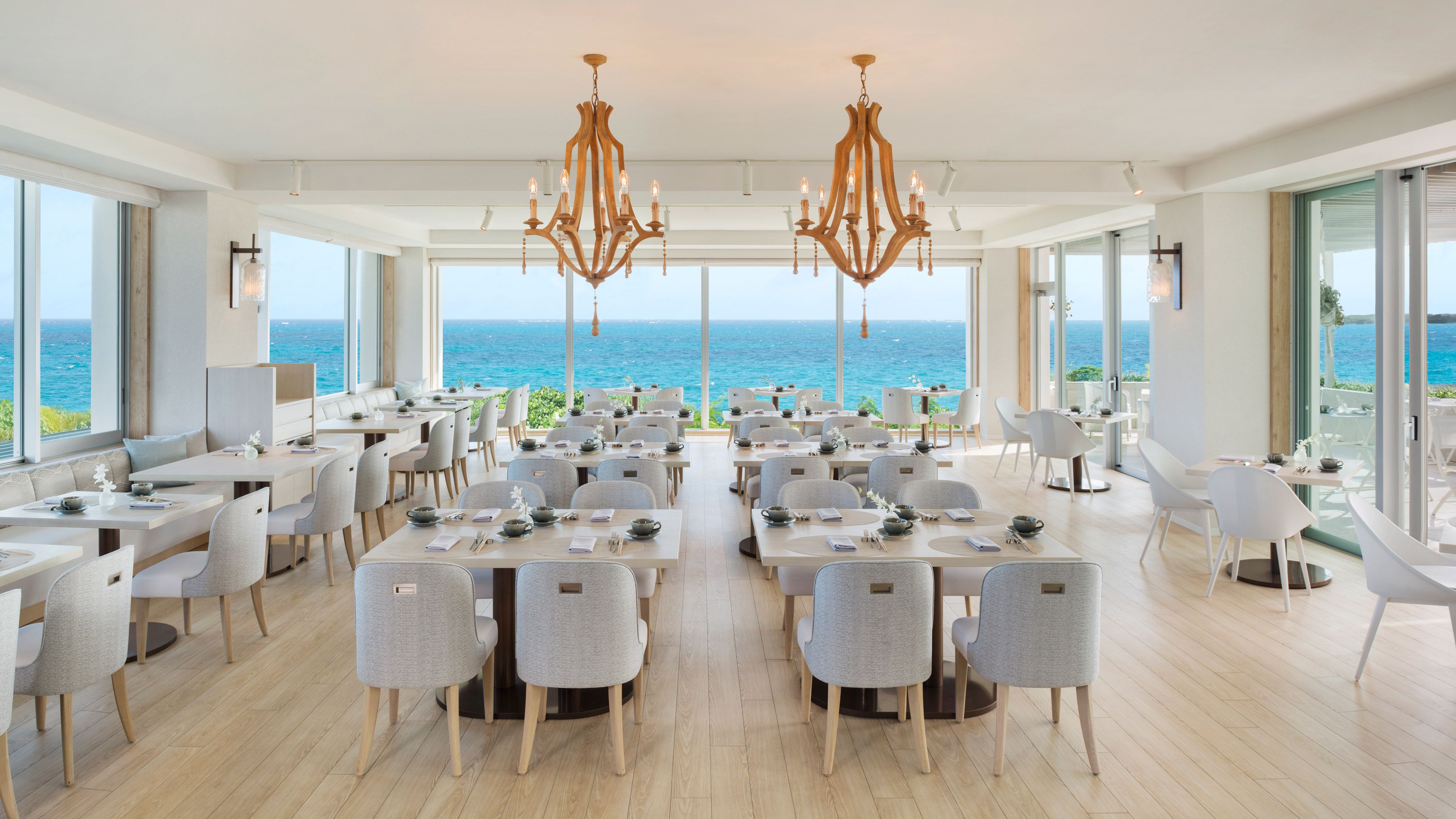 Windows widely placed to the three directions, panoramic view of the ocean can be enjoyed from this restaurant.