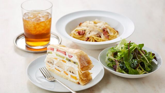 Cuisine Menu [Stand 1] Strawberry mousse, strawberry millefeuille, vanilla macaron 【Stand 2】Strawberry, prosciutto and kale croissant sandwich 【Stand 3】Avocado canapes, seasonal vegetable and smoked salmon quiche, strawberry and prosciutto, mozzarella cheese salad