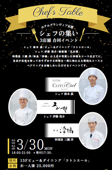 This course meal will feature dishes created by Chef Suzuki Subaru of View & Dining "Kotoshier," Chef Ito Ryosuke of Teppanyaki "Gozan Nozomi," and Executive Chef Mise Hiroshi of Japanese Cuisine "Ukihashi." This event will allow you to enjoy a special course that brings together dishes that each chef confidently recommends, along with pairings.