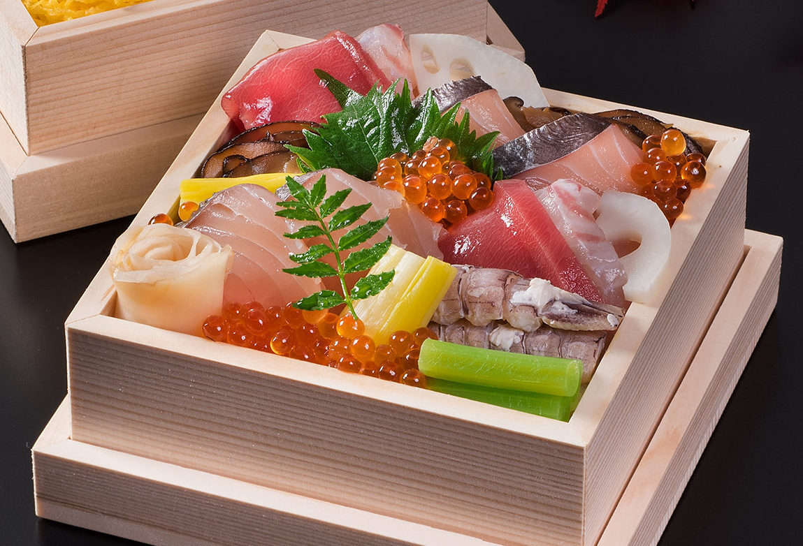 The menu features small portions of delicious food, mainly ingredients from Okayama and the Seto Inland Sea, presented in colorful small bowls and presented in gorgeous lattice wooden boxes.