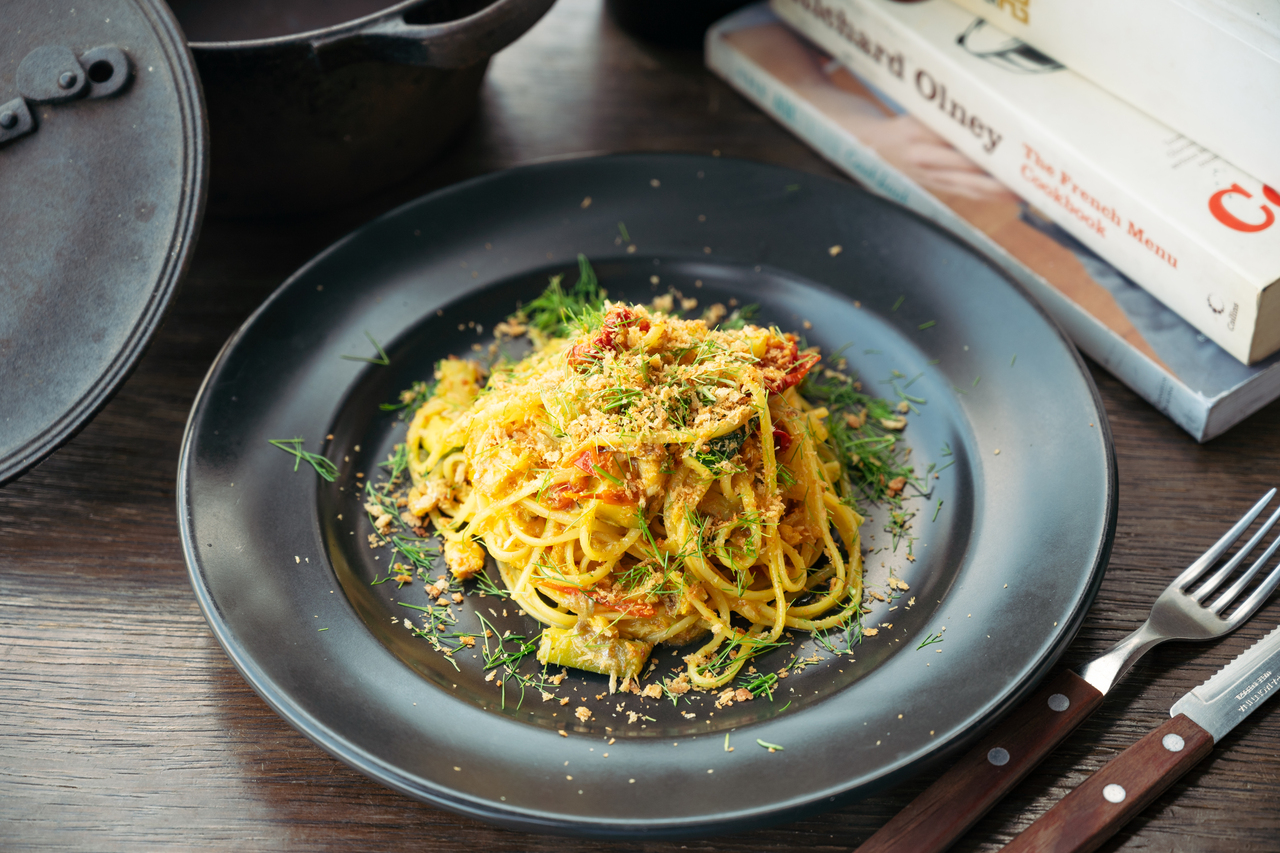 バヴェッティーニ 秋刀魚とプチトマト、茗荷のアーリオオーリオ