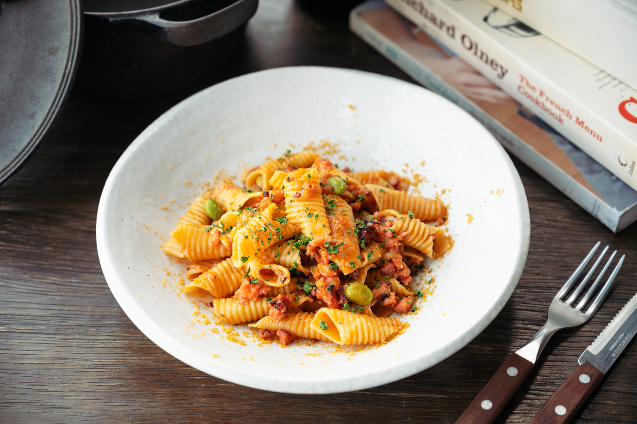 自家製ガルガネッリ 真ダコと枝豆の軽いトマトソース