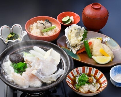 ふぐちり、小鉢、酢かき、かきとふぐの天ぷら、かき飯、香の物、汁