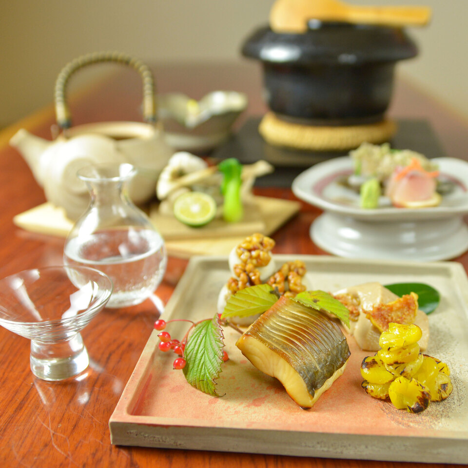 青山・赤坂で日々料理を仕込んできた料理長が、産直の有機野菜や旬魚介、特撰食材を厳選して仕込む季節料理と、〆には僖ニ成ル食名物「宇和島産直山崎鯛」の特製鯛だしで二八そばをご堪能いただける「僖ニ成ル食京橋」の人気コースです。