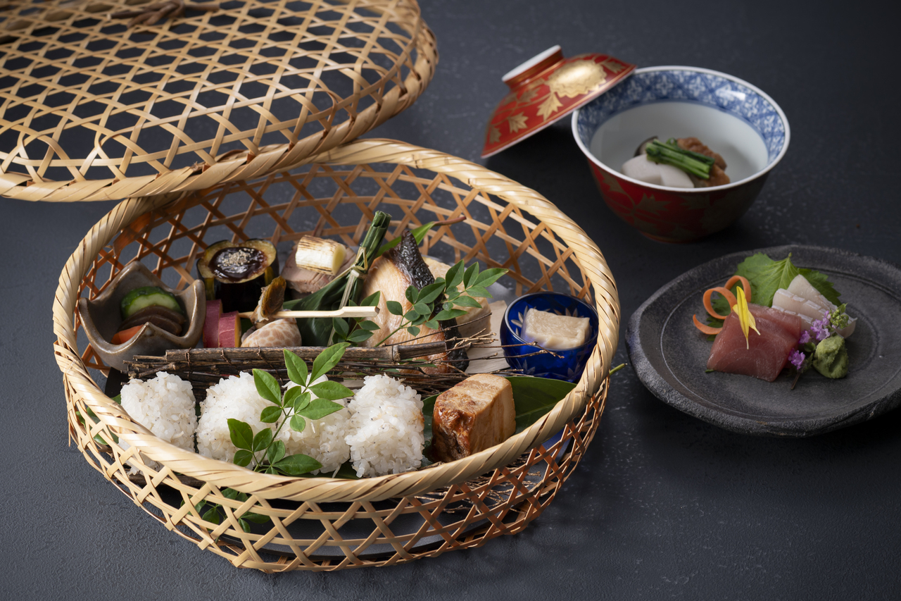 四季折々の京都の風情が詰まった籠盛りは、彩り鮮やかで見た目にも楽しい一品となっております。籠盛りの「京御膳」で、京都の美食と伝統を心ゆくまでご堪能ください。