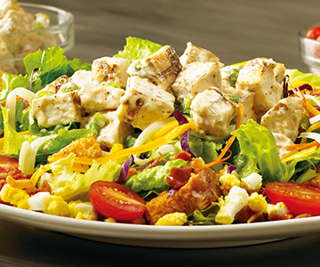 Fresh chicken salad on a bed of mixed greens with Steppen and Cheddar, bacon, diced egg, tomatoes and croutons. Served with sesame dressing.