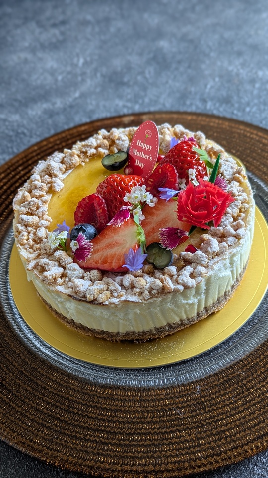 シャインマスカットの自家製レーズンをベイクドチーズに加えました。レアチーズとパイナップルのジュレで仕上げた爽やかなチーズケーキ。