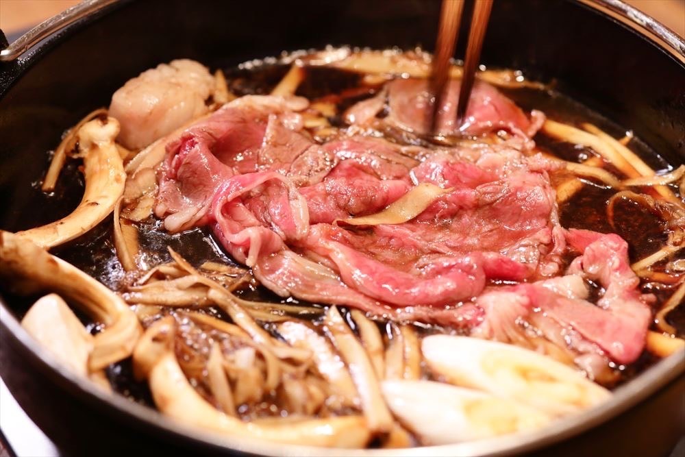 Sukiyaki made with carefully selected Japanese black beef. Two appetizers, sukiyaki, a meal (rice or udon), and a dessert.
