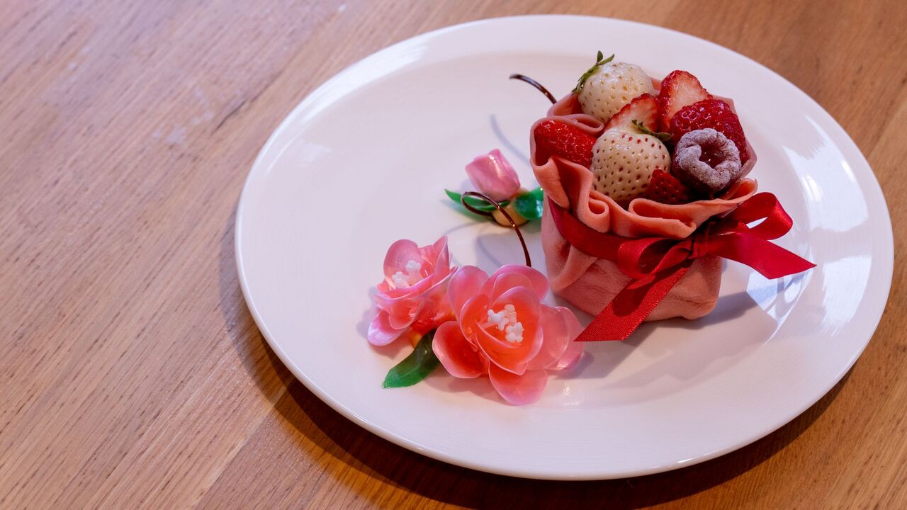 苺のスペシャルアフタヌーンティー あまおう・古都華・淡雪など、旬を迎えた苺を贅沢に使用。 苺のタルト、苺とピスタチオのムース、苺とホワイトチョコのマカロン、苺のスコーンを彩り豊かに揃えました。 さらに、お客様の目の前で温かい苺の蜂蜜ソースをかけて仕上げる〈苺と蜂蜜のパンペルデュ〉のライブドルチェ付き。 苺の香りと甘みを五感で楽しむ、特別な午後をお過ごしください。