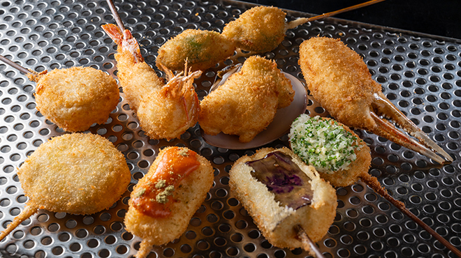Set contents: 18 skewers (Wagyu beef, crab claws, chicken wings, seasonal seafood, seasonal vegetables, etc.) plus cabbage and vegetable sticks - 8,800 yen per person (tax included)