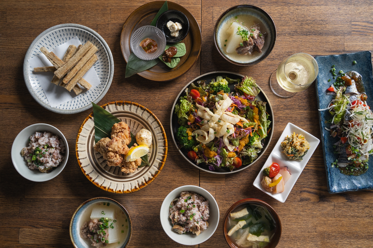 ・Crunchy green salad with colorful vegetables・Fried chicken・White fish and root vegetables with sweet and sour sauce・French fries and mini croquettes・Homemade cheese tofu with baguette・Edamame and deep-fried tofu with salt sauce・Marinated seasonal vegetables