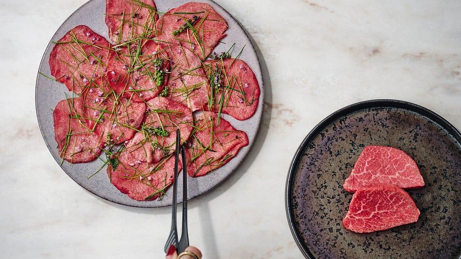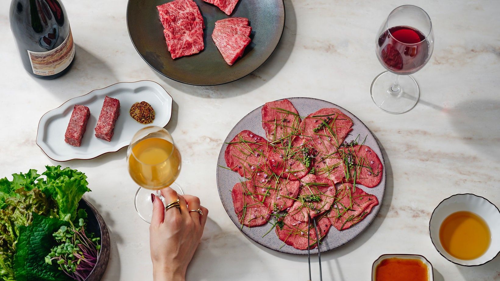 Kimchi Namul Bar (iba't ibang Koreanong nilutong gulay na may pampalasa) Salad Naruto wakame soup (wakame mula sa Naruto) Wagyu terrine Premium na dila ng baka na may asin at scallion Premium harami (skirt steak) Gupit ng araw Marbled yaki-suki roast (iniihaw, sukiyaki-style) 2 uri ng horumon (bituka) Kanín Dessert