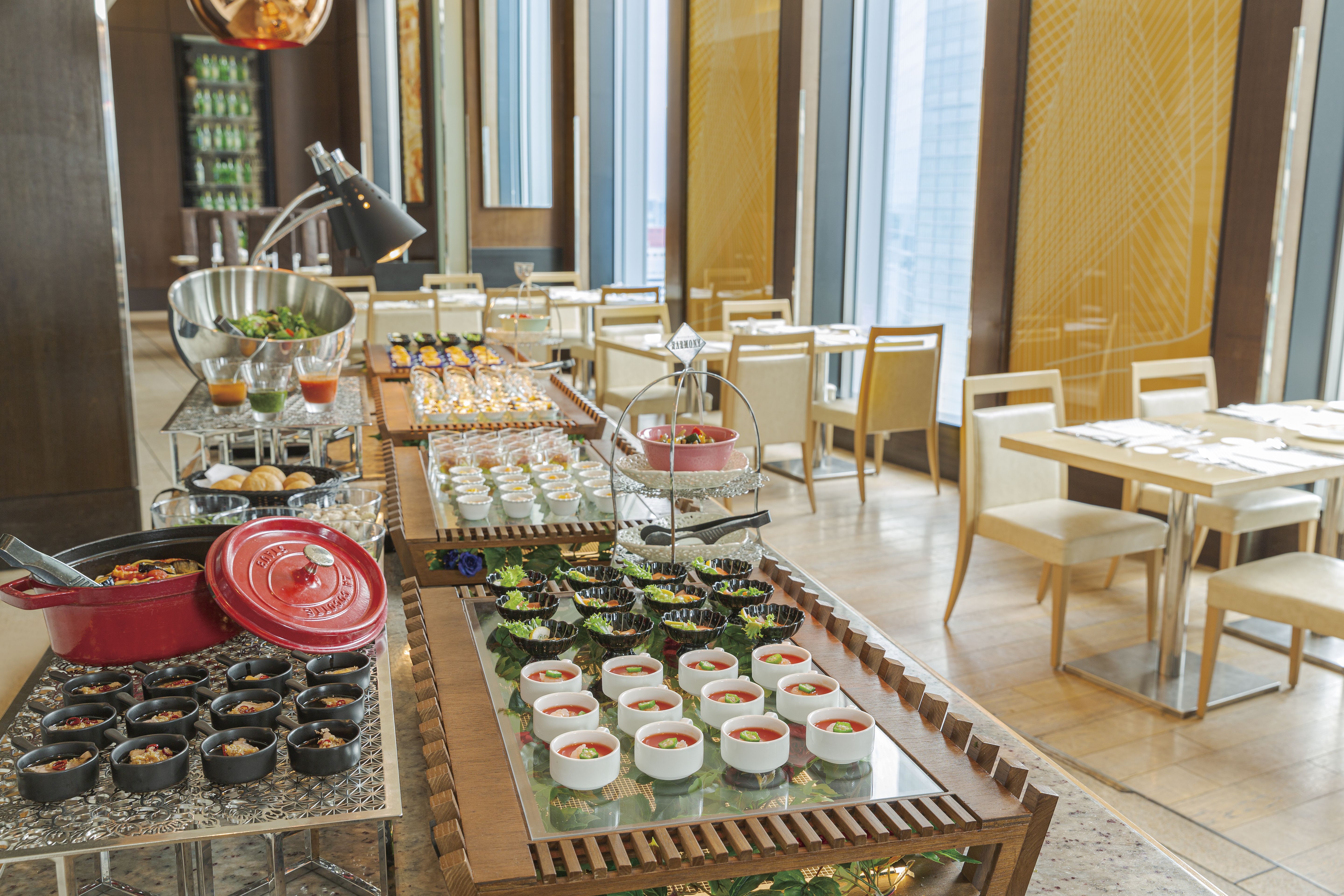 ザ ロイヤルパークホテル アイコニック東京汐留 24階にあるオールデイダイニング ハーモニーは、味覚だけではなく視覚でもご満足いただけるサービスを提供しており、厳選された食材の数々は一流のシェフ達によって季節に合わせたメニューへと生まれ変わります。 大きな窓からは東京の夜景が一望でき、夜には星空のようなネオンがお楽しみいただけます。 また、アフタヌーンティーではスイス高級ティーブランド「SIROCCO」の茶葉を多数ご用意しておりますので、ゆったりとした空間でティータイムをお過ごしください。