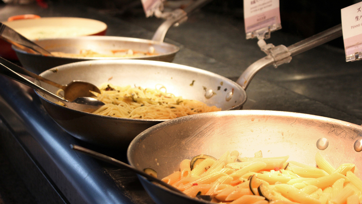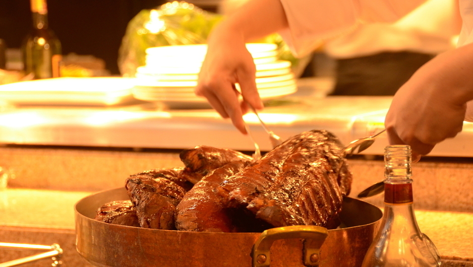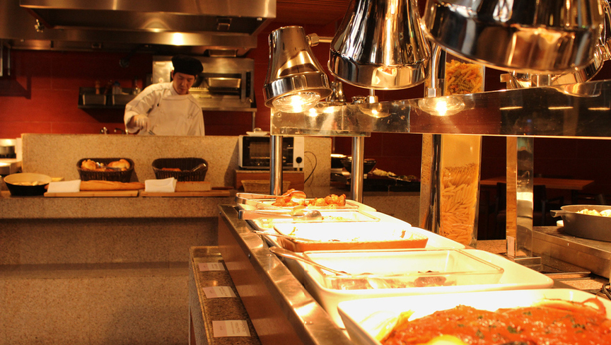 Bright, open kitchen space located behind the hotel lobby. The interior's stylish design and window views of the outdoor trees creates a calm atmosphere for all to drop by and admire. We offer various buffet-style meals including our chef's special Italian stone-baked pizzas, teppanyaki and a variety of appetizers. We also offer a dynamic menu of home-made desserts and a seasonal buffet.