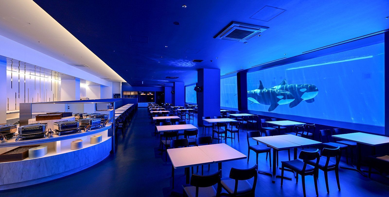 A buffet restaurant where you can enjoy your meal while watching killer whales. The restaurant is designed in the image of the vast open ocean, befitting the killer whales, the kings of the sea that inhabit the world's oceans. The seating area is a buffet-style restaurant with an image of UNDER WATER and white sandy BEACH.