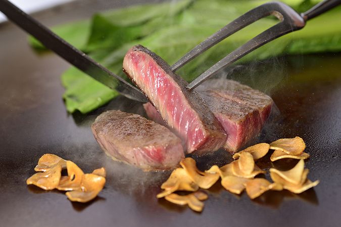 The high-class black interior is suitable for enjoying the high-class and stylish teppanyaki. You can see the night view of Okayama city from the inside of the restaurant, making it a romantic space. Most of the ingredients used at Bisai Teppanyaki are local ingredients from Okayama. The local specialty of Okayama caught in the surrounding sea area are dynamically grilled on an iron plate.