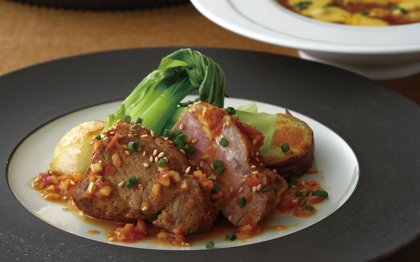 ・スモーク豚ロース肉の網焼き スパイシー黒にんにくバルサミコビネガーソース