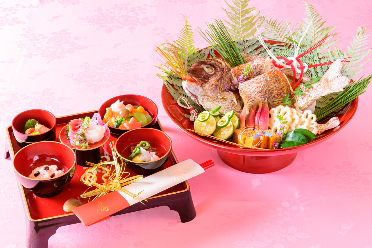 The set menu includes the first meal, grilled whole sea bream, and meals for the parents, for a total of seven dishes.
