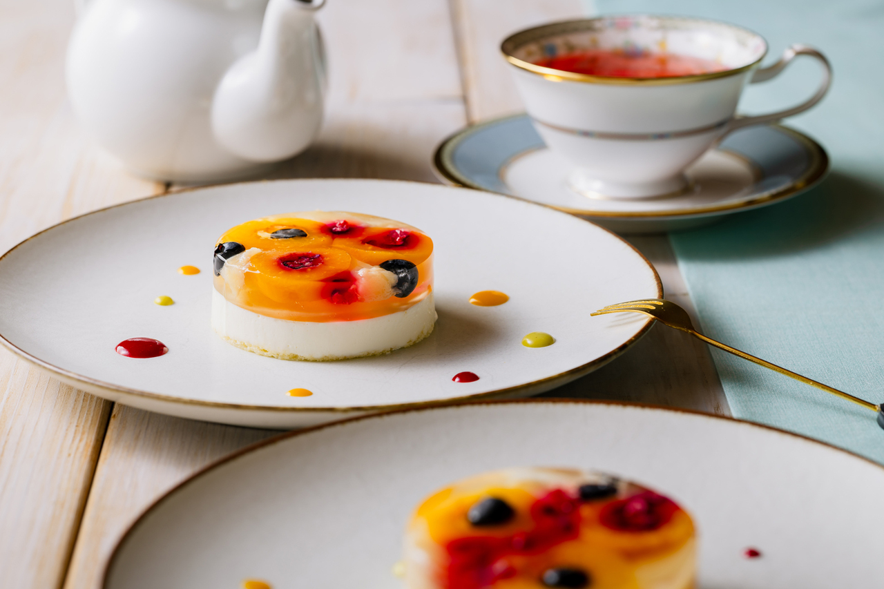 この逸品に合わせるのは、紅茶検定上級の資格を持つ支配人・梶山が選定した、ロンネフェルト社のフルーツハーブティー。クランベリーとレモンが香る芳醇な一杯が、スイーツの爽やかでクリーミーな味わいを一層引き立てます。初夏の優雅なティータイムをお楽しみください。