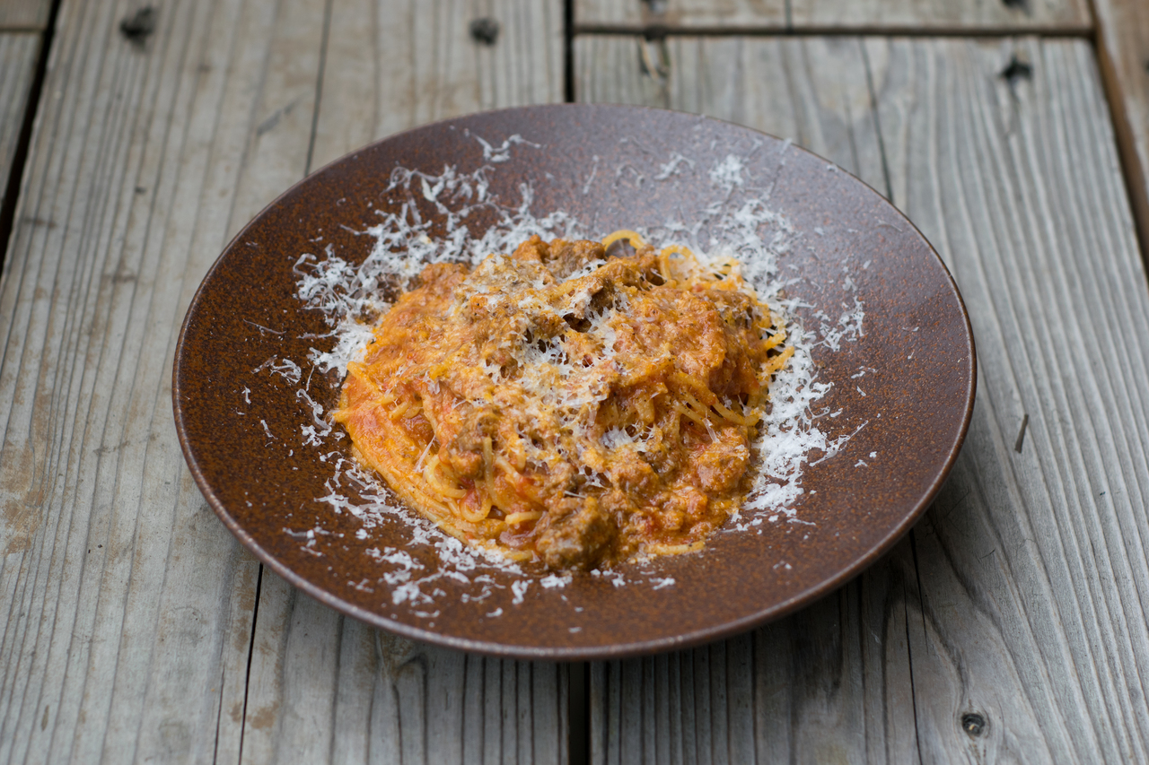 スパゲッティーニ 牛スジとフレッシュトマト、たっぷりニンニクのトマトソース~ペコリーノチーズがけ~