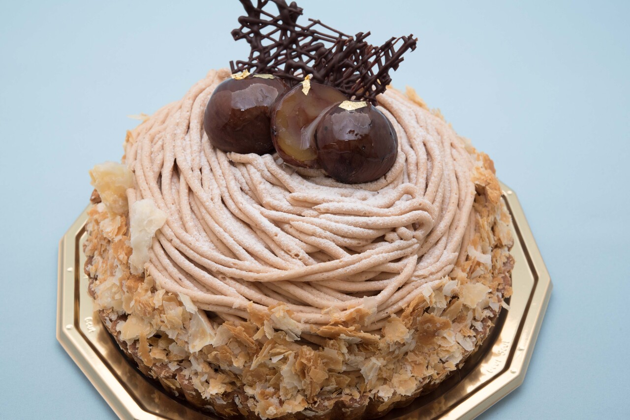 タルトケーキにカスタード、マロンムース、栗の甘露煮、スポンジをサンドして生クリームとマロンクリームをたっぷりとのせたボリューム満点のドームケーキです。