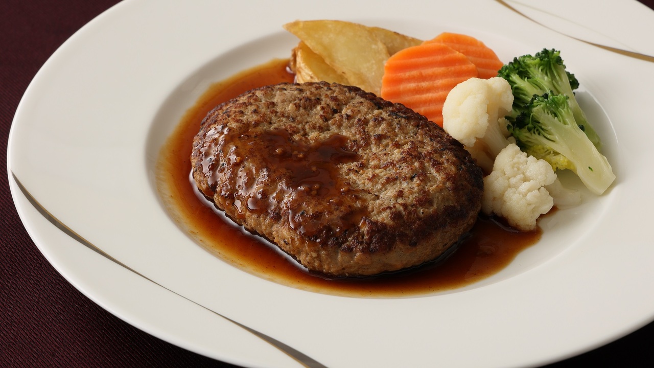 ハンバーグステーキに、サラダとライスまたはパンが付いたセット