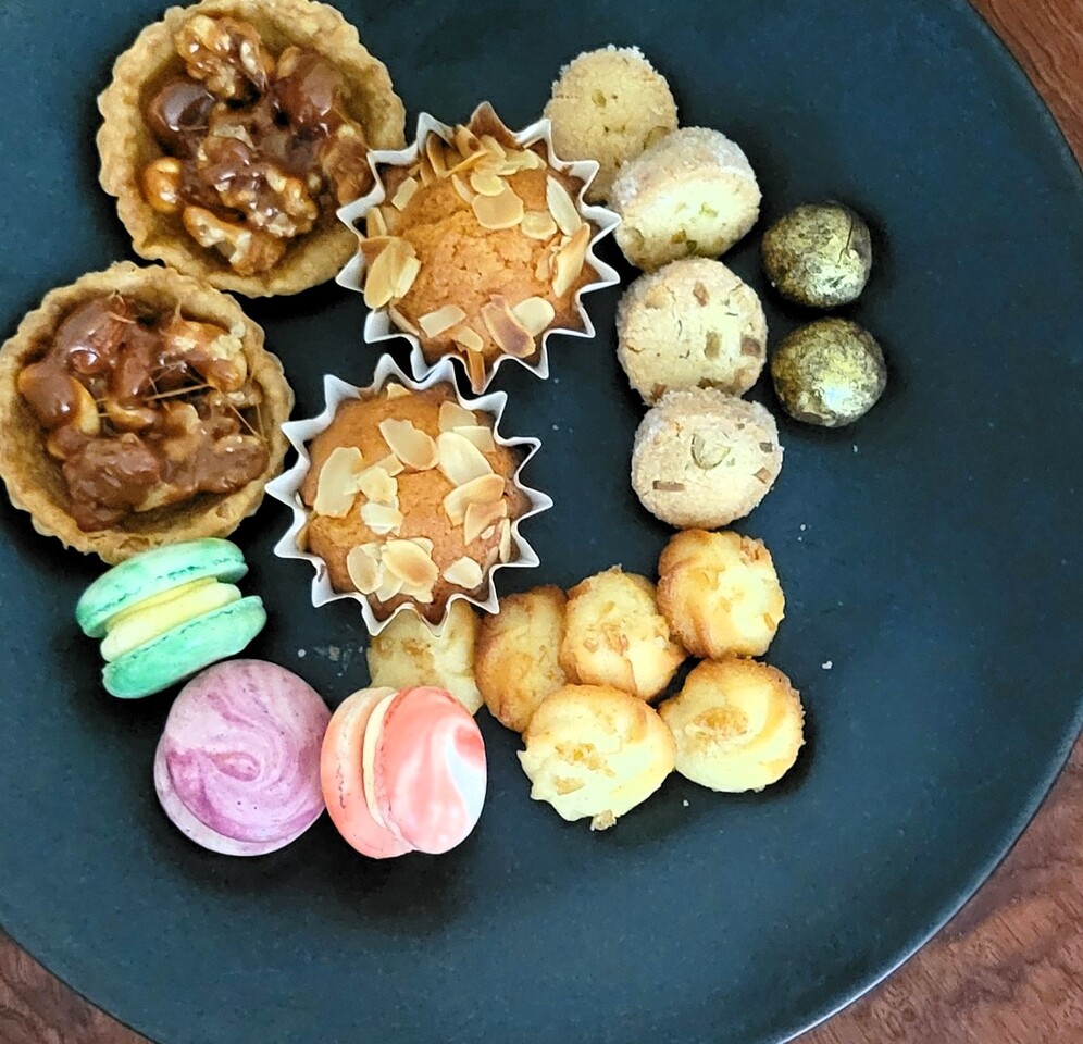 [Contents] Earl grey meringue, beetroot sable, limoncello fresh chocolate, dark cherry cake, macarons (orange, plum, hazelnut praline), fruit pâté (sweet cherry, pink grapefruit)
