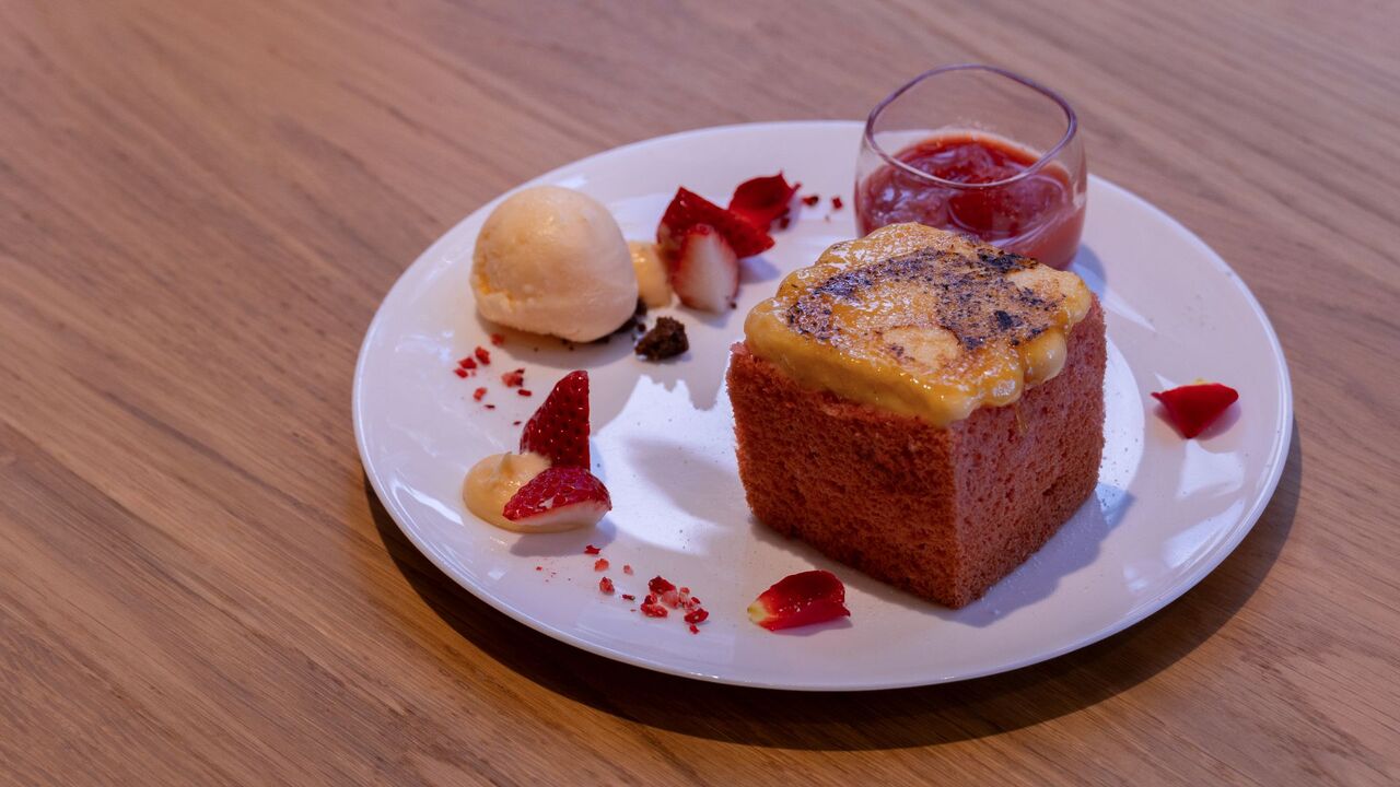 ストロベリーフェアシリーズ。ふわふわに焼き上げた苺香るシフォンに、生クリームと苺ソースを閉じ込めました。表面に絞ったカスタードを目の前で香ばしくキャラメリゼ。近代化産業遺産建築のカフェで味わう、出来たてのライブドルチェ。