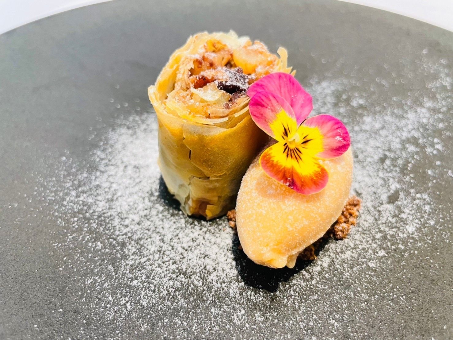 Example of course: Amuse-bouche, 5 kinds of appetizers, salad, hot appetizer, burger, fish dish, palate cleanser, meat dish, avant dessert, grand dessert, tea and snacks