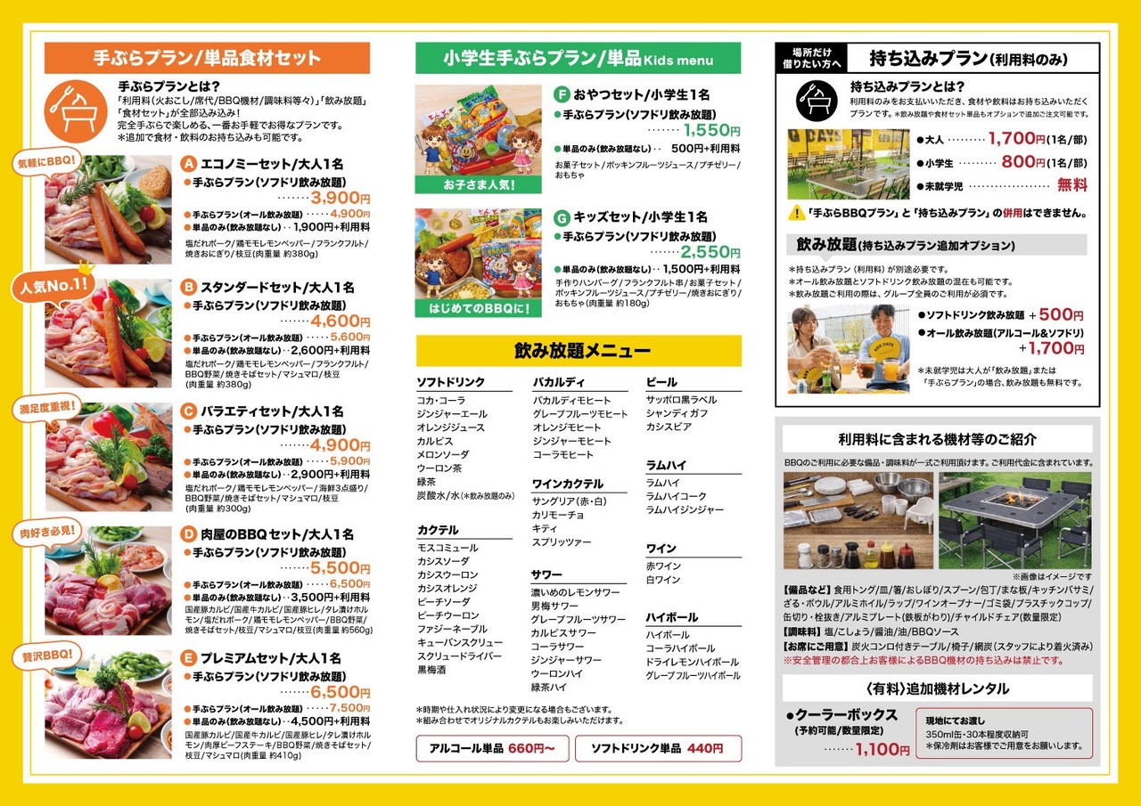 🔴ご利用には「手ぶらBBQプラン」または「持ち込みプラン」のいずれかを、小学生以上のお客様全員分ご選択ください。