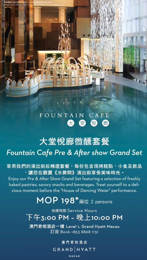 Join us daily from 3:00 PM to 10:00 PM at #FountainCafe an exclusive pre and after show offer for “The House of Dancing Water”. Enjoy a set for two at MOP198*, featuring a snack platter and a selection of beverages. Make your show experience even more delightful with this special treat before or after the performance.