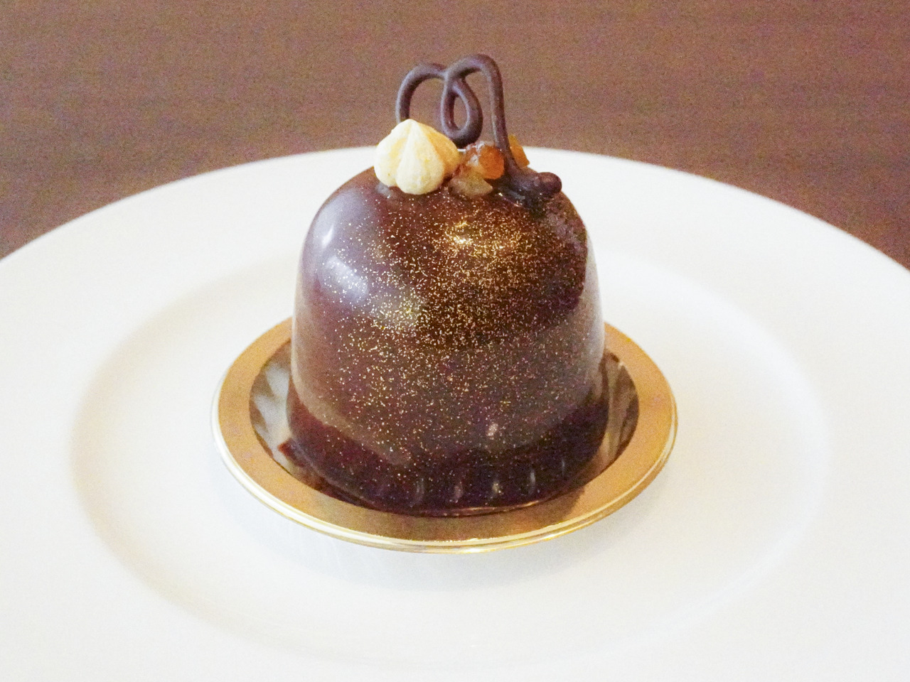 VALRHONAのグアナラを使った濃厚ショコラムースに、フランボワーズ、ピスタチオ、チョコレートクランチの層で味と食感の変化を楽しめます。クリスマスにぴったりなチョコレートのごちそうです。