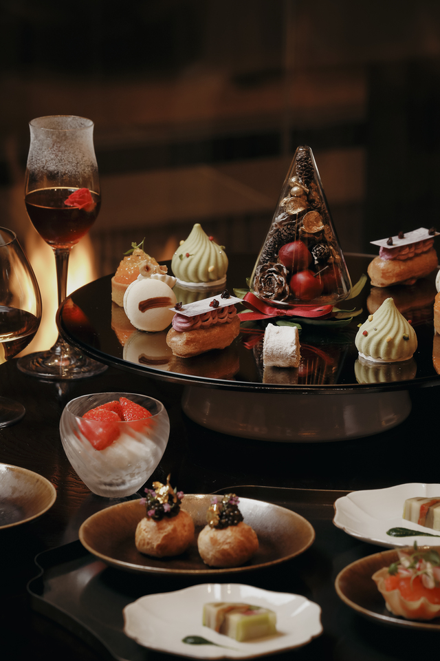 The festive afternoon tea begins with a gorgeous rose-scented sparkling tea and continues with a course menu that includes everything from savory dishes that delicately express the bounty of winter to an assortment of sweets decorated with seasonal fruits and spices. Fragrant brown rice tea, strong black tea, and Japanese herbal teas made with shell ginger, amacha, and yuzu complement each other's flavors, elevating the aftertaste of each menu.