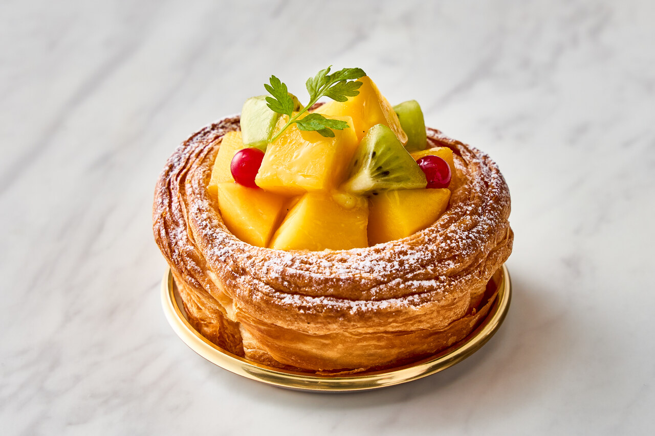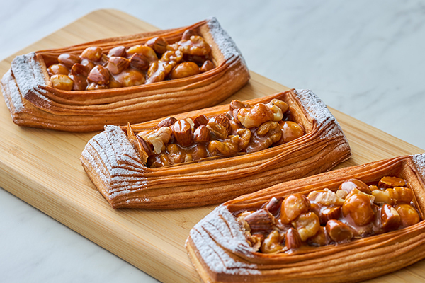 何層にも折り重ねた繊細な層が魅力のデニッシュ生地にチョコレートクリームを絞り、キャラメリゼしたマカダミアナッツ、アーモンド、くるみの3種類のナッツを乗せて焼き上げました。噛むたびにはじけるナッツのカリッとした食感と香ばしさ、キャラメリゼのほろ苦い甘みがデニッシュ生地と見事に調和した多層的な食感が楽しいデニッシュです。