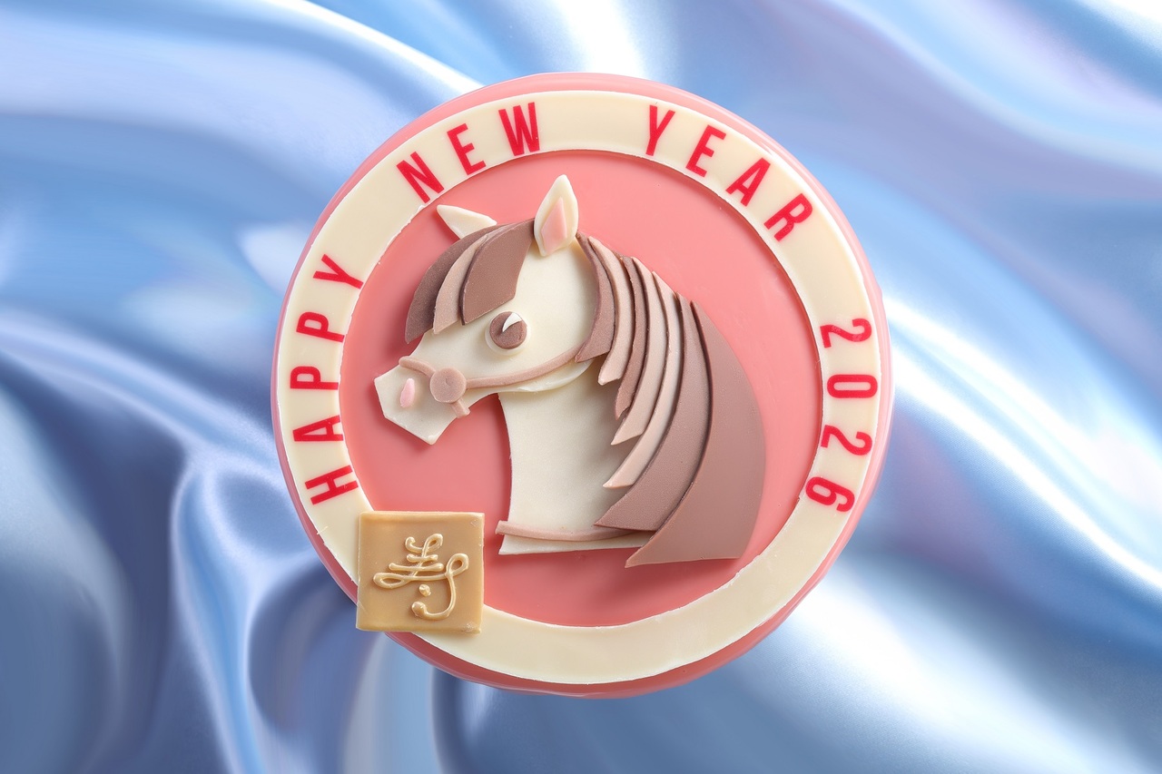 「干支スイーツ ~午~」は、チョコレートで白馬を表現した、メルヘンチックなパステルピンクのムースケーキです。ライチのムースとジュレを甘酸っぱいいちごのムースで包み込み、さっぱりとした味わいに仕上げています。ご家族やご親戚が集まる新年の食卓に、お正月の手土産におすすめのスイーツです。