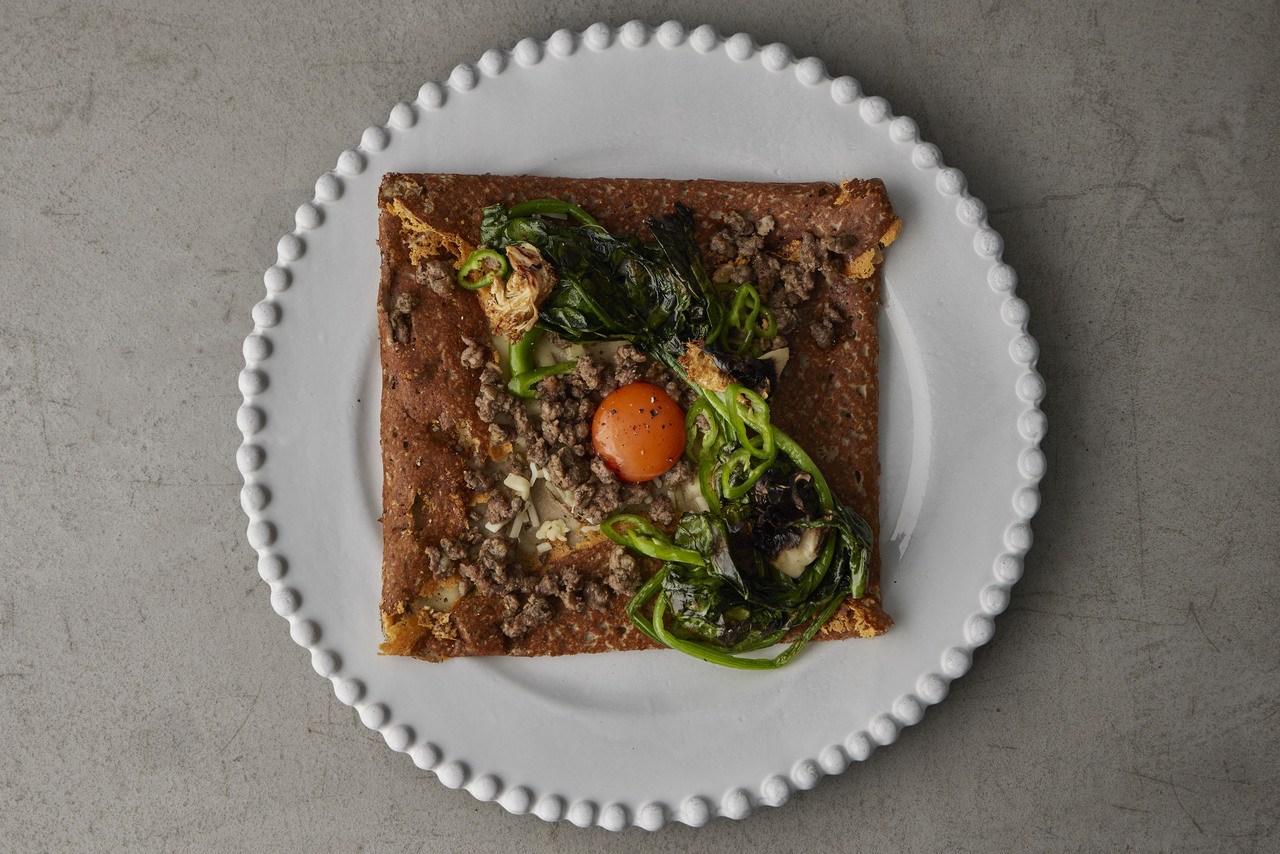 チーズとともにに焼き上げたそば粉のガレットを、旬のしらすと秋野菜のグリルで飾り付け、中央に卵黄をトッピング。たっぷりちらしたしらすの下にはマッシュルームの旨味、白ワインの甘みを凝縮させたデュクセルソースを合わせました。お好みですだちを絞ってお召し上がりください。