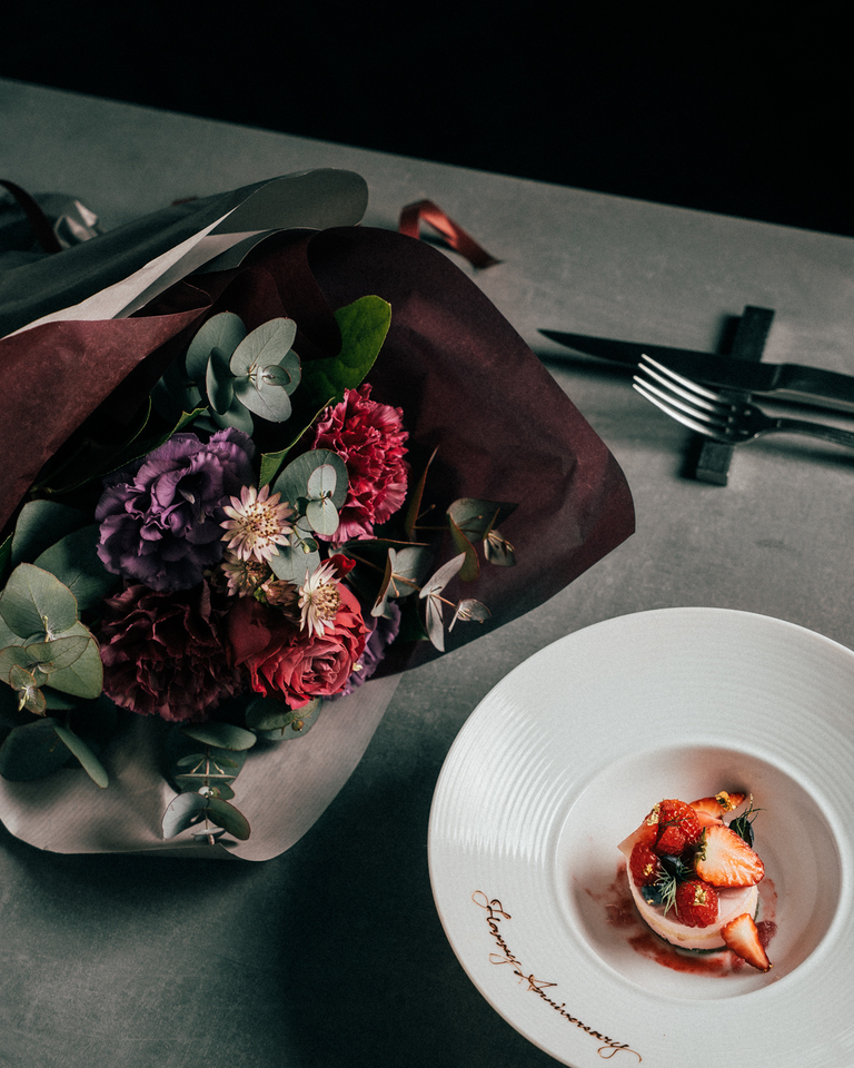 +1000円でコースのデザートにメッセージを追加できます。(花束オプション選択の場合は無料)