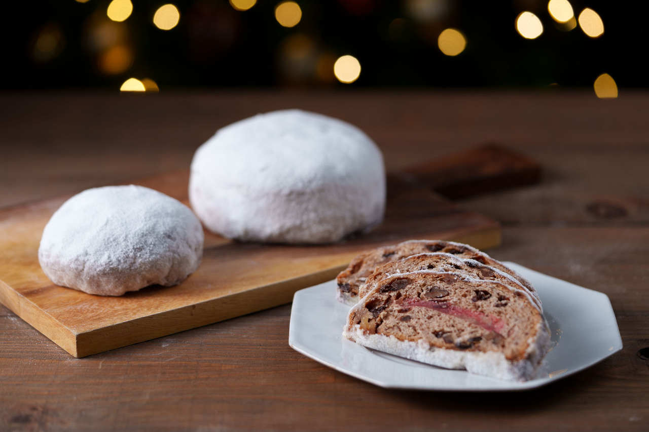 いちごテイストの生地に、クランベリーとブルーベリーのドライフルーツ、ピスタチオ、ウォールナッツを加えたフルーティーなシュトーレン。鮮やかなピンク色で、ほのかな甘さと爽やかないちごの香りが口いっぱいに広がります。