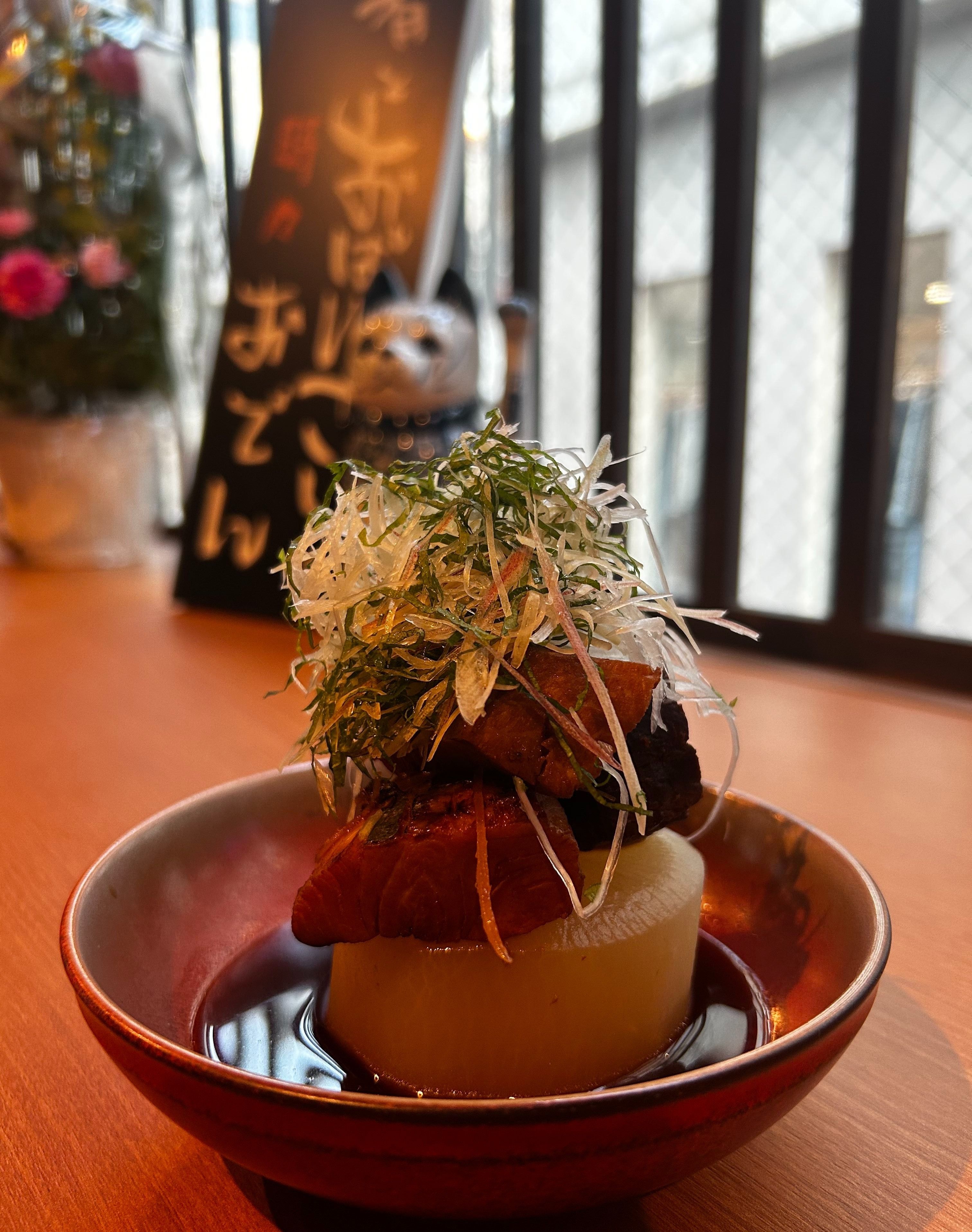 招牌有鸭肉坚果土豆沙拉、季节小菜和本店特色关东煮。各式卷物可作下酒菜或收尾。蟹肉可乐饼配“追加蟹”。还有少见的日本利口酒与10种以上地酒,可从小杯品饮。于吧台感受现场氛围,轻松享受美食与美酒。