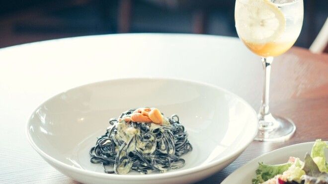 店内はボタニカルな雰囲気が広がる空間です。ランチからカフェ、ディナーまで、時間に合わせたおいしい料理を提供いたします。ランチは、アオリイカと菜の花のジェノベーゼやスパイシーラムカレー、オニオングラタンスープやフォカッチャなどのメニューが豊富です。カフェタイムには、ガラス張りのペストリーでパティシエが作るスイーツを提供。ディナーではチャイニーズチキンサラダや仔牛のカツレツなど、イタリアンをベースにした多国籍料理をご用意しています。