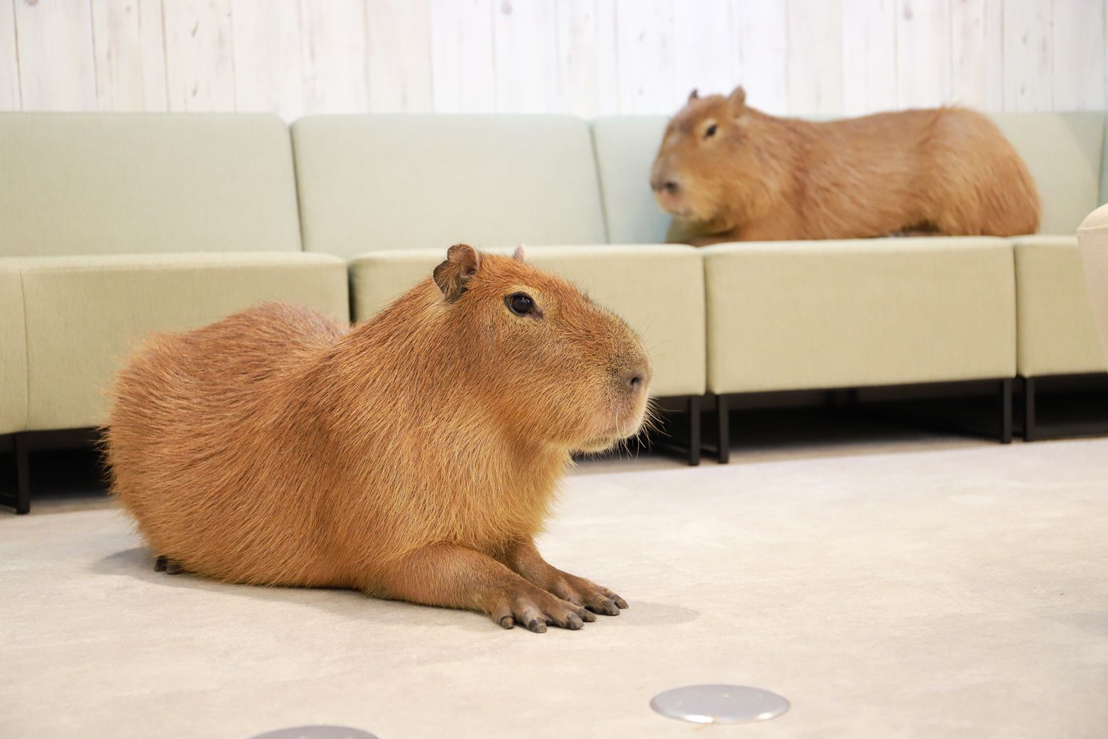 浅草駅近くにある「cafe capyba Asakusa」は、二頭のカピバラと触れ合える癒しの空間です。自然光が差し込む落ち着いた店内でカフェタイムを楽しみながらも、自由に歩くカピバラにおやつをあげたり、写真を撮ることができます。ご利用は予約制のため、事前にWEBサイトから来店予約をお願い致します。